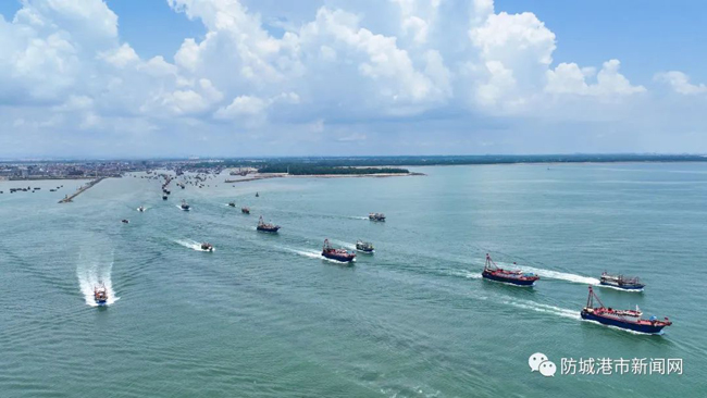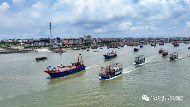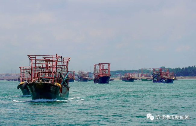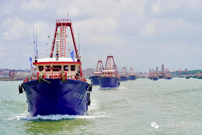 渔船排起长龙,有序驶出企沙渔港。