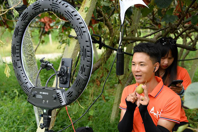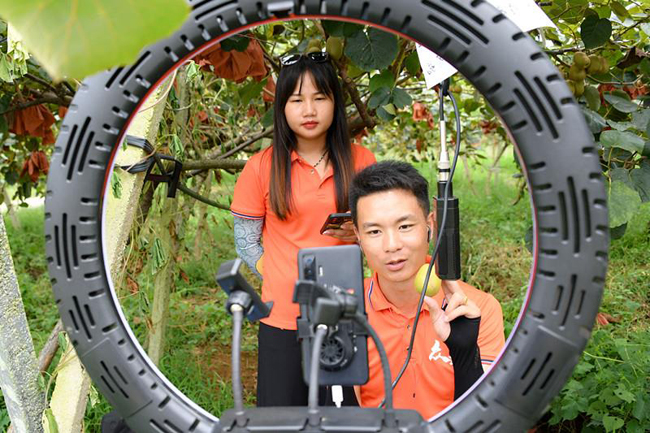 主播在手机前向全国网友推介销售罗城红心猕猴桃。
