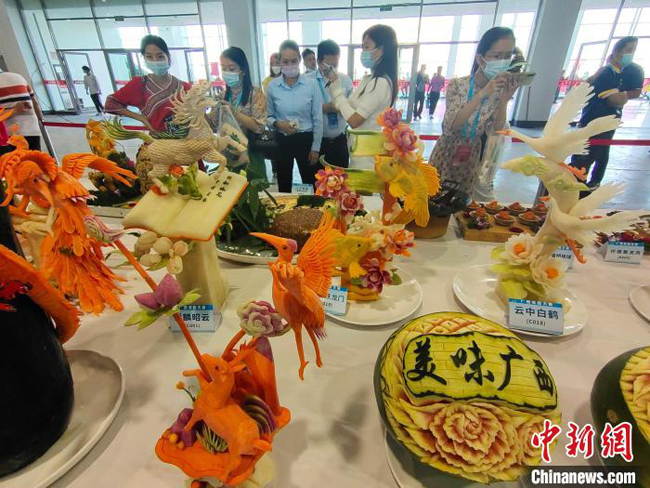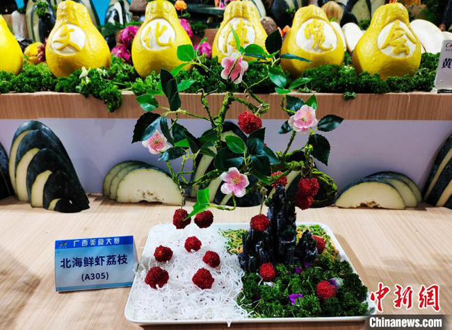玉林扣肉、客家白切猪脚、梧州纸包鸡、阳朔啤酒鱼、恭城油茶、横县鱼生、沙蟹汁豆角、壮族五色糯米饭……广西餐饮美食大赛现场设置了大型美食展台,广西14个地市的500多道特色菜、地方小吃及桂菜宴席集中展示。此项比赛,由组委会组织的专家和消费者采取“热菜冷评”方式评定,并授予奖牌。