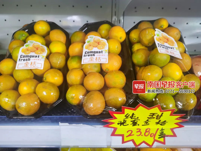 在南宁市新竹路、水街的几家水果专卖店,脆蜜金桔根据品质区别分为16.8元/盒、23.8元/盒几个级别,换算下来30~38元/公斤。