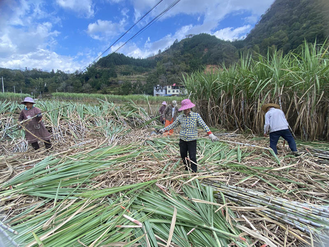 蔗农忙着在田间采收甘蔗。