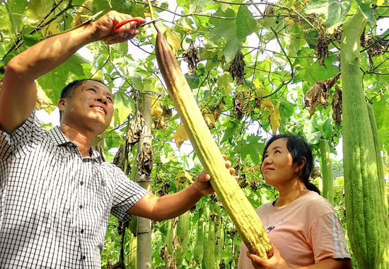 脱贫户李成龙笑着说:“我也种了两亩多丝瓜,平时在管好自己种的丝瓜后,还和老婆去合作社打工,每人每天可得80元工钱,很合算。”
