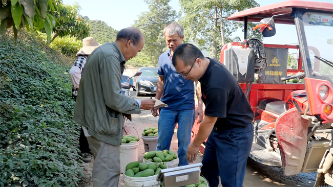 近日,记者在田阳区那坡镇晚塘村公篓四季蜜芒收购点看到,果农正忙着将自家成熟的四季密芒运来这里销售,过磅、分拣、装箱、打包、装车,忙的不亦乐乎,每个人脸上都洋溢着丰收的喜悦。