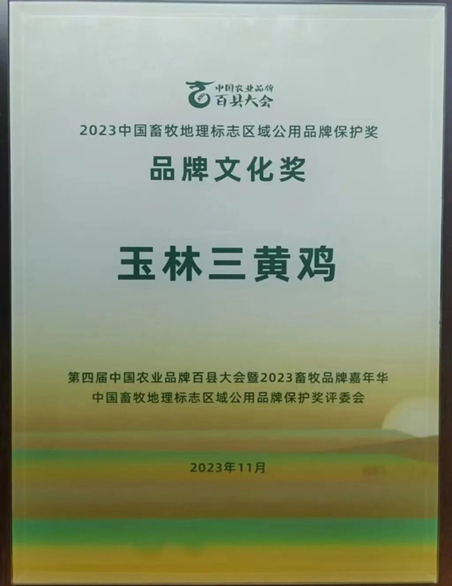 会上集中发布了《2023中国农业产业强镇品牌声誉评价报告》《2023中国地理标志农产品区域公用品牌声誉评价报告》《2023中国畜牧地理标志区域公用品牌声誉评价报告》,并以“畜牧业的地理标志区域公用品牌保护”为核心要义,评选出了中国畜牧地理标志区域公用品牌声誉百强奖、2023中国地理标志农产品区域公用品牌保护奖等系列奖项,“玉林三黄鸡”当仁不让拿下两项大奖。