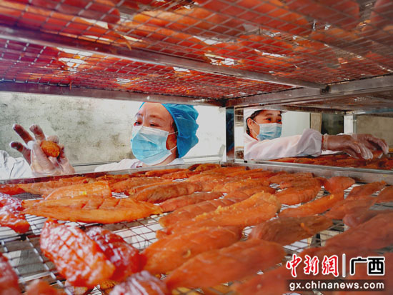 “过完春节我们姊妹们趁着晴好天气就开始加工黄金薯果脯了。”在广西桂林市灌阳县灌阳镇仁合村沙罗源红薯产业加工厂里,负责人范珍玉介绍说。
