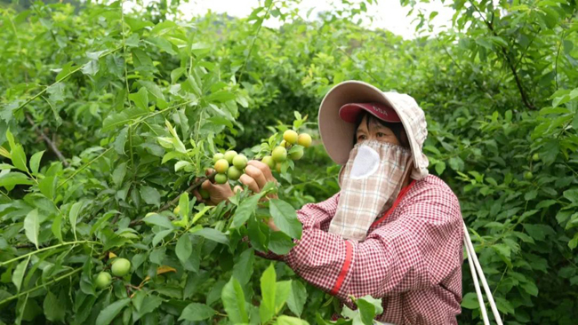 天等县把荷乡把兰村通洞屯种植户 覃金兰:我家种李果五六年了,平时乡政府组织来我们怎么种植怎么剪枝,现在种起来有经验了,每年产量还不错,有老板来收,我也自己卖。