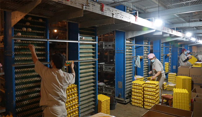 “我们的设备比以前更先进,更智能化,以前要拉车进鸡舍捡鸡蛋,现在直接在传输带上捡,效率高得多。”陈彬说,喂料机在设定时间自动喂食;蛋鸡排泄物则通过输送设备将鸡粪及时清理出去。