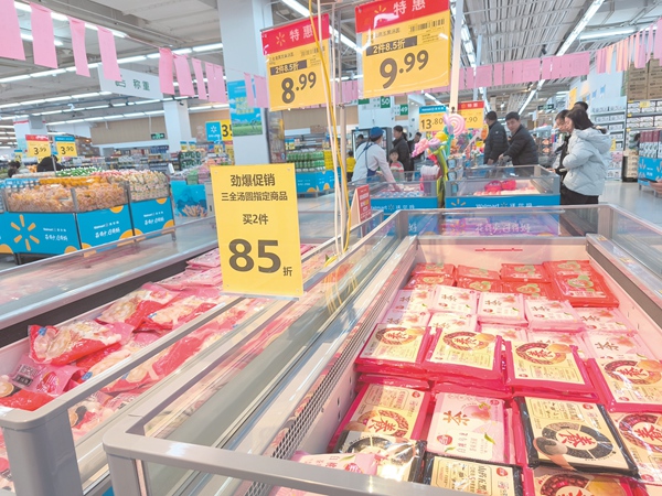 “卖汤圆,卖汤圆,小二哥的汤圆是圆又圆,要吃汤圆快来买,吃了汤圆好团圆……”走进朝阳路沃尔玛超市(印象城店),消费者循着歌声来到汤圆销售区域,在选购汤圆的同时,还可以参与猜灯谜活动,享受欢快愉悦的购物体验。超市推出了指定商品买2件85折的促销活动,性价比高,吸引了消费者前来选购。“这款山药五黑汤圆销量很好,能吃到黑豆、黑米、黑麦、黑枸杞、黑芝麻等药食同源食材,而且不甜不腻,深受大众喜爱。”该超市工作人员表示,眼下只剩几包了,等会还要加货。