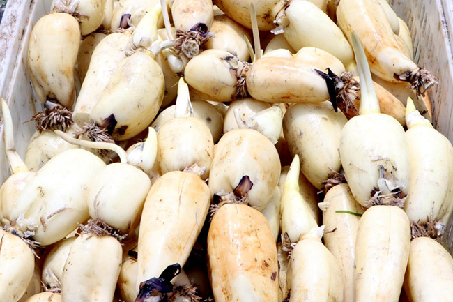 百朋镇里团村阳村屯的藕农覃春余一边忙着采挖莲藕,一边笑着说:“今天天还没亮我们就开始下田采挖,目前已采收200多斤新鲜莲藕。趁着市面上莲藕还没大量上市,我们提前出货,每斤的收购价相较上市高峰期能多出几块钱,收入也能增加不少。”