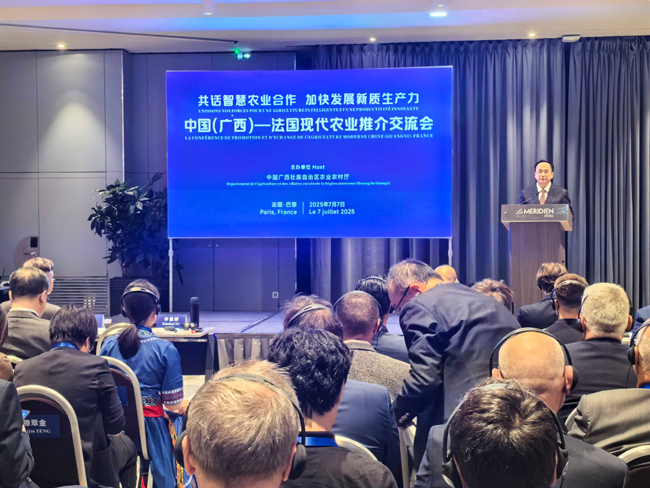 为进一步加强中国广西与法国的交流合作,推动双方智慧农业、产供链互利共赢,以“共话智慧农业合作 加快发展新质生产力”为主题的中国(广西)—法国现代农业推介交流会于当地时间2025年7月7日下午在法国巴黎举办。中法政府机构、农业企业、行业协会、科研院所及侨界代表近百人出席活动。