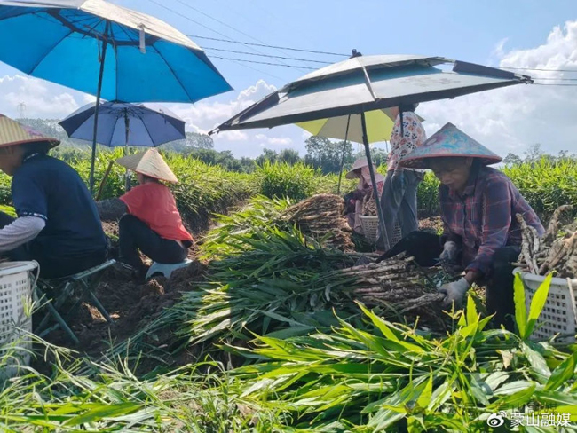 烈日下,工人们汗水湿透衣背,却满脸笑容。他们跟着陆老板干活五六年了,收姜季每天能赚200元甚至更多,“在这里干活挺好,陆老板人好,工资按时发,离家近,还能照顾家里。”一位工人说道。田垄上,一筐筐新鲜姜芽被码好装箱,正在等待运往加工点。