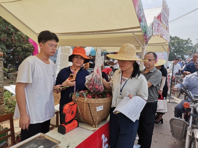 活动期间,主会场特别设立“快速检测+合格证开具”便民服务岗亭。工作人员对场内销售的荔枝生产经营主体提供点对点服务:一方面指导其规范开具承诺达标合格证,另一方面对销售荔枝进行现场抽样并开展农药残留快速检测。经检测,现场随机抽检的8批次荔枝样品全部合格,检测结果在岗亭显著位置实时公示,为消费者提供即时的安全保障。