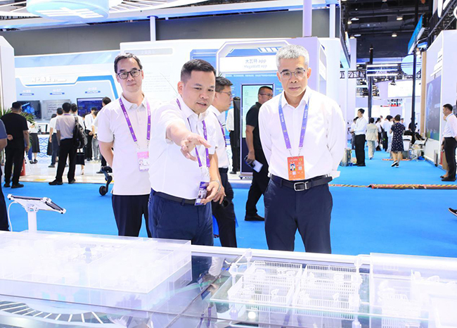 在“AI+农业”展区,黄智宇沿畜牧、渔业、种植三大主题区域参观。在畜牧区域,广西扬翔集团的“料、育、养、宰、肉”数智沙盘,企业通过沙盘与大屏演示人工智能生猪一体化数智平台,他查看精喂仪、查情宝等实物,详询数智育种、精准饲喂等技术细节,指出畜牧是广西农业重要支柱,需依托AI优化生猪全生命周期管理,推动产业向高效、智能、安全方向发展。在渔业区域,东兴市红树林农业的自动化全封闭循环水养殖车间沙盘,清晰呈现南美白对虾数字化养殖全流程。他了解企业自主研发的AI投料机、水下摄像系统等应用效果,认可其关键环节创新解决方案,鼓励企业深耕水产养殖智能化,助力广西渔业转型升级。在种植区域,他听取捷佳润、广西慧云的技术介绍,关注智能传感设备、“天—空—地”一体化植保装备及数字化服务系统,肯定AI覆盖种植全产业链的应用,并就应用场景拓展、市场定位优化与企业负责人深入探讨。