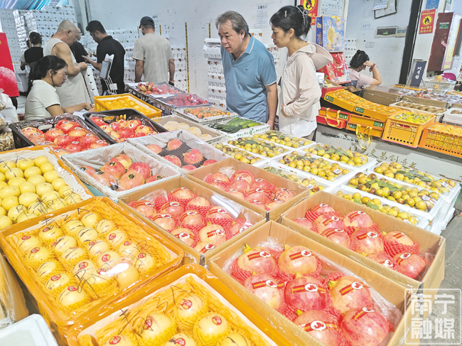 在广西海吉星水果批发市场,多家水果店铺门前整齐摆放着苹果、石榴、柚子、葡萄、火龙果、猕猴桃等各类时令水果。其中,石榴、冬枣、柚子刚上市不久,吸引不少消费者购买尝鲜。