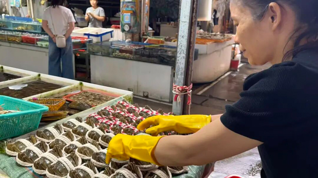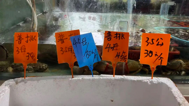 随后,记者又来到海吉星市场,有不少商家摆出“江苏大闸蟹满黄满膏”的牌子。商户李女士提到,相较于节假日,当前大闸蟹价格每只普遍下跌1-2元,且随着十月底螃蟹产量增加,市场供应将更充足。在市场中,2两规格母蟹售价15-20元/只,3两规格母蟹与4两规格公蟹售价25-30元/只,5两规格公蟹售价40-45元/只,部分小规格螃蟹最低价已降至8元/只。
