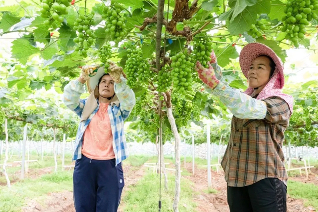 截至目前,田林已建成标准化温室大棚24座,配套建设小型保鲜冷库、智能采收棚等农业基础设施,同步推进游客中心、泉水湖公园、科普教育基地、中小学劳动实践基地等文旅设施建设;并投入光明区级帮扶资金350万元,对爱善村200栋民房实施建筑风貌提升改造,将昔日小山村打造成生态宜居、独具壮族特色的秀美新农村,为产业融合发展筑牢坚实根基。通过“公司+村集体经济(合作社)+基地+农户+保险”模式,实现葡萄种植规模化、标准化发展,有效破解了当地传统农业“小散弱”难题。