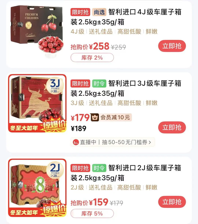 另据上游新闻报道, 在重庆某超市,市民张小姐向记者坦言:“上周1公斤装的3J级智利车厘子还要近300元,去年这个时候也得250元左右,现在只要188元,便宜了不少。”据此计算,3J级智利车厘子每公斤价格一周降幅超过30%。“前几天1公斤装的2J级车厘子还要188元,今天就降到138元了。”超市店员介绍。