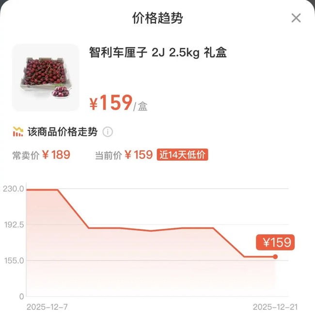 其中2J车厘子的近14天低价显示,其12月7日的价格为230元/2.5kg,截至21日已降价71元。
