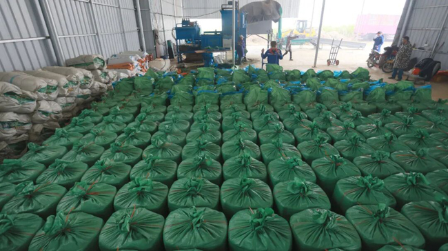小编抵达加工厂时,机器的轰鸣声便扑面而来。只见开阔的场地里,几名工作人员分工明确,将一捆捆甘蔗叶投入机器料槽进行粉碎,再由传送带传送到压缩、包装设备进行封装。最后,把包装好的青贮饲料运送到成品区进行存放,整条流水线一气呵成。