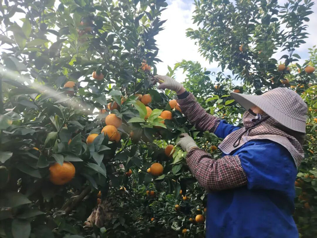 在华山村一个120亩的基地果园里,金黄的果实挂满枝头,圆润饱满,工人们正忙着剪果,一派热闹景象。“今年雨水得宜,果子长势好,个头也比往年大。”基地负责人陆胜拿起一颗刚摘下的沃柑介绍道,“果皮光滑紧实,汁水多,甜度也刚刚好。”由于今年沃柑转色早、品相好,在市场上特别受欢迎,价格约为每斤2.2元。果园开摘后,陆胜雇请了15名工人帮忙,每人每天工钱150元,有效带动了附近村民就近务工。