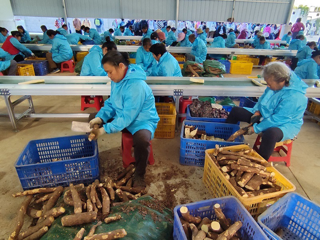 2025年,城中区种植的木薯以“华南9号”黄心木薯和“桂热10号”白心木薯为主,种植面积629.2亩、同比增长2.5%,产量971.2吨、同比增长4.5%。这些木薯除部分供应本地生鲜市场外,其余则直供食品加工厂,用于制作木薯羹、糕点等产品,实现“从田间到餐桌”的高效转化。