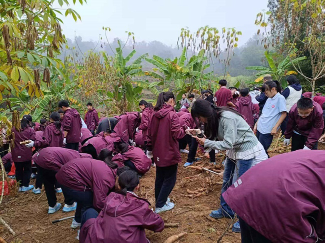 在木薯加工基地,老师首先向同学们讲解了木薯的植物学特性、生长周期、营养价值及经济价值等知识,并带领同学们参观了水晶木薯的生产过程。随后,同学们来到田间地头,在农户的示范与指导下,有些同学合力将粗壮的木薯块茎从土壤中拔出,有些同学则小心翼翼地尝试使用农具挖木薯,田间不时响起“挖到了,木薯好大!”的欢呼声。同学们亲手触摸饱满硕大的块根,感受泥土的芬芳与劳作的汗水,深刻体会到了“一粥一饭,当思来之不易”的内涵,对农业生产有了更直观、更真切的认知。