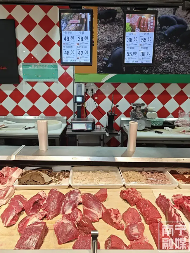 在星光大道一家大型超市的生鲜肉专区,不少消费者正在挑选牛肉。价签显示:牛腱子肉49.8元/斤、吊龙肉48.8元/斤、牛腩38.8元/斤、精品牛梅头肉42.8元/斤。销售人员表示:“相比2024年,价格确实有所上涨,但和2025年相比,仍处于相对稳定的低位。我们店的牛肉多是本地新鲜牛肉,目前这个价位还是比较划算的。”