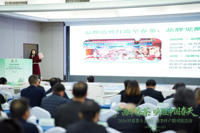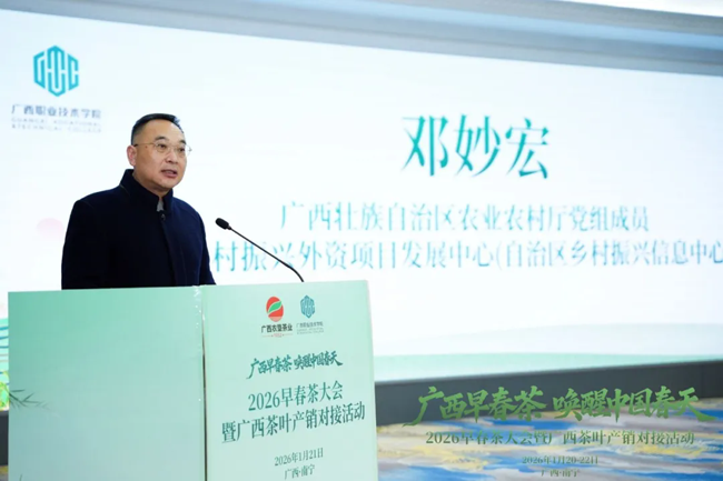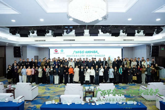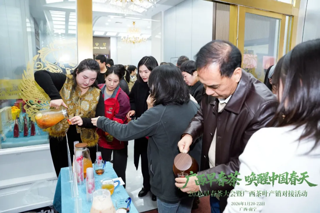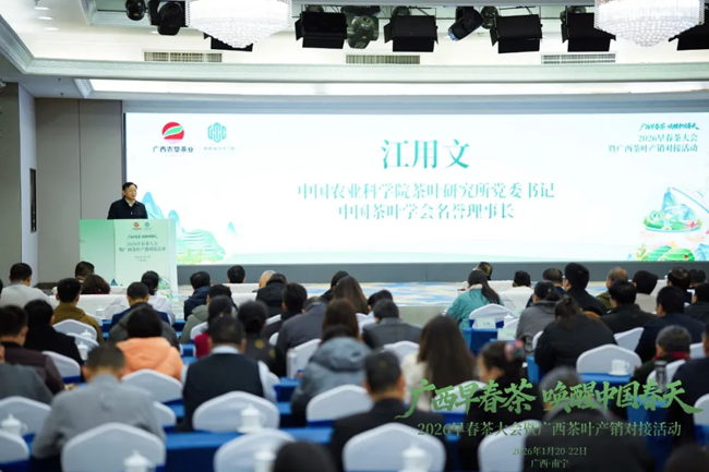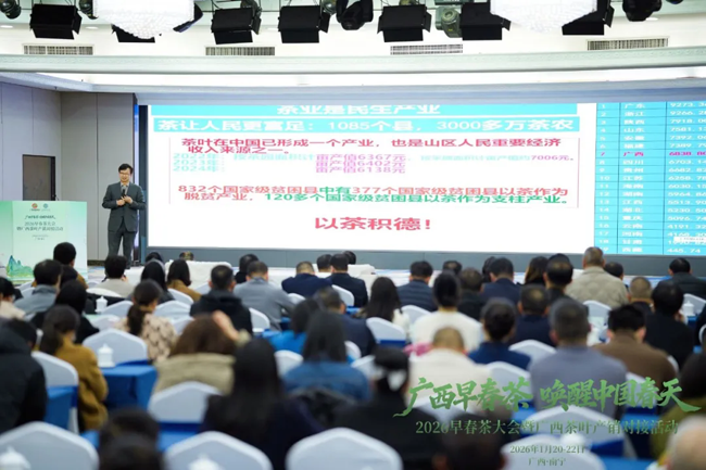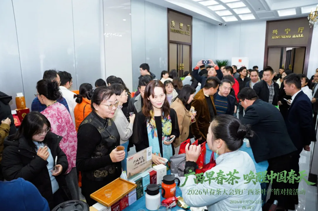 1月21日上午,以“广西早春茶·唤醒中国春天”为主题的2026早春茶大会暨广西茶叶产销对接活动在广西南宁举行。来自全国各地的200余家茶企、茶商齐聚一堂,共品南国“第一杯春茶”,也正式拉开广西新春茶市序幕。