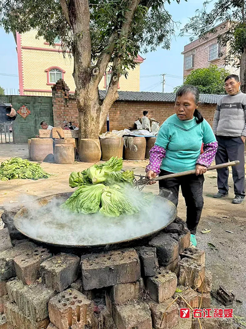 冬日暖阳铺满百色市右江区福禄村茨勒屯的田野,村民黄阿婆正弓着腰,将饱满脆嫩的芥菜从泥土里连根拔起。翠绿的菜叶沾着晨露,在阳光下泛着油亮的光,不远处的空地上,一口架在砖石灶上的大铁锅正蒸腾着白雾,新鲜芥菜在沸水里翻涌,数小时后,它们将带着烟火气进入陶坛,在时间的作用下转化为酸香醇厚的福禄酸菜。这一幕,正是福禄村“小酸菜撬动大产业” 的生动注脚。