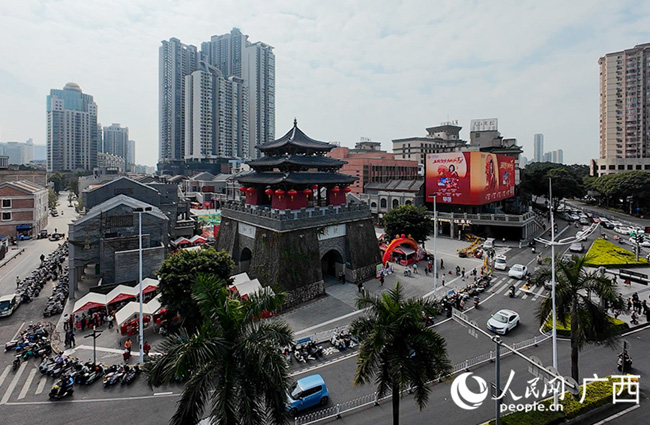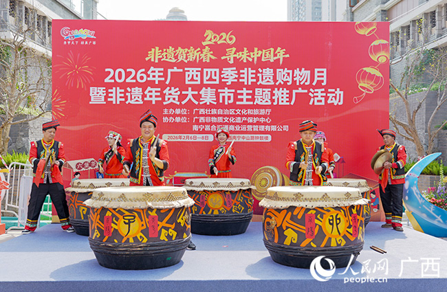 2月6日,“非遗贺新春·寻味中国年”2026年广西四季非遗购物月暨非遗年货大集市,在南宁市中山路钟鼓楼热闹开市。