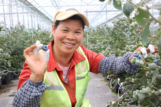 工人在基地采摘蓝莓增加收入,喜笑颜开。记者 毛丽婷 摄
