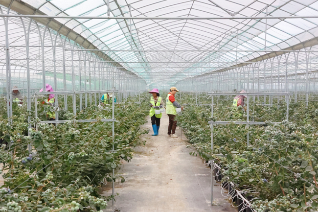 工人们在大棚里采摘蓝莓。记者 毛丽婷 摄