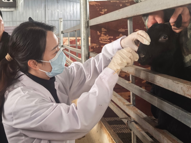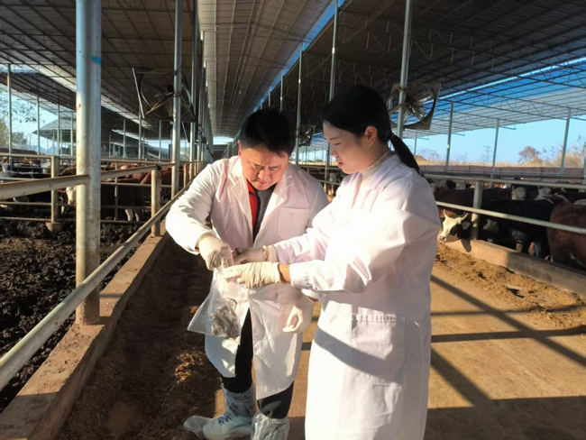 近日,广西兽医研究所牛羊疫病防控团队一行3人,深入桂林市雁山区、来宾市兴宾区的三家养殖企业开展冬春季牛羊疫病防治科技服务。技术人员首先察看养殖场舍的通风条件、清洁卫生、保温设施等环境状况,细致观察牛羊精神状态、采食情况及活动表现。随后,与养殖场负责人、一线饲养员开展交流,重点摸清牛羊引进途径、疫苗免疫程序、日粮配方及饲喂方式等饲养信息。结合冬春季疫病流行特点,技术人员从气候应激、生物安全、饲养管理、免疫保护等多方面,对各养殖场进行全面疫病风险评估。为进一步精准诊断疫病,科技人员在现场采集了牛羊样品,将送至实验室开展病原学检测,为养殖场提供针对性防控方案。广西兽医研究所牛羊疫病防控团队以实际行动践行科技助农使命,为冬春季肉牛肉羊产业稳定发展注入强心剂,助力养殖企业降本增效、筑牢动物疫病防控第一道防线。