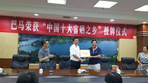 8月12日,中国富硒联盟在巴马瑶族自治县举行授牌仪式,授予巴马“中国十大富硒之乡”牌匾。之前该县已获“世界长寿之乡”“中国长寿之乡”“中国香猪之乡”等国字号荣誉。
