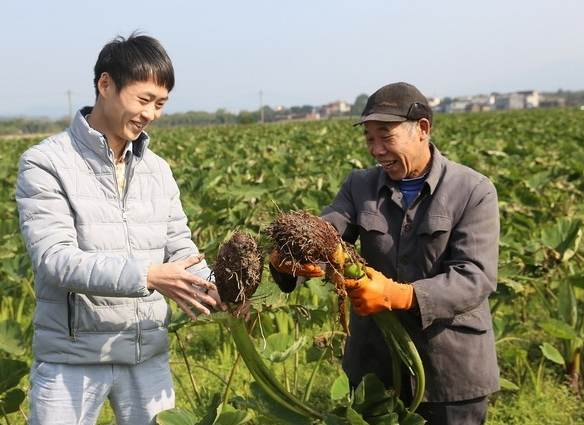 12月16日,灌阳县兴农电子商务有限公司经理蒋青松在向黄关镇李官村下湘洞屯芋农蒋运通收购芋头,检验灌阳香芋的品质。