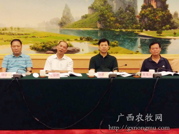 会议现场。图为全国政协常委、中国民盟广西主委刘慕仁(右二)、自治区人大常委、农委副主任黄海光(右一)、自治区农机局副局长江垣德(左二)