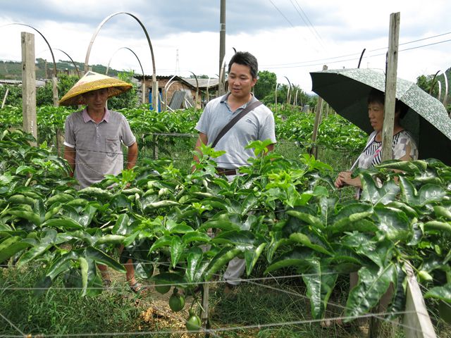 市水果办主任刘永忠(中)在金旺百香果合作社考察百香果挂果情况