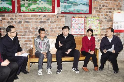 2月10日,自治区党委常委、市委书记王小东深入国定贫困县——隆安县调研指导脱贫攻坚工作。图为王小东书记在南圩镇銮正村贫困户覃振权家中,考察菜牛养殖等产业帮扶项目推广工作情况。