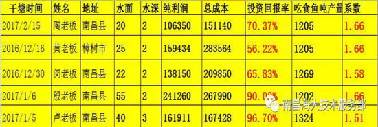 从以上5位海大客户卖鱼时间看,最早的是在2016年12月16日干塘的黄老板,最晚干塘的是陶老板,以上投资回报率对比,卢老板的投资回报率最高(96.7%),其吃食鱼吨饲料净产量达到了1324斤,其次是闵老板的产量在1269斤,其投资回报率只有65.83%,实际上其草鱼销售价格仅仅4.5元/斤,以上陶老板在2月15日干塘,其草鱼销售价格5.2元/斤,其投资回报率也达到了70.37%,从以上5位养殖朋友的养殖信息分析,要取得高的利润,核心还是要提升主养品种草鱼的产量,吃食鱼的吨饲料净产量提升对养殖成本的控制至关重要,以上投资回报率存在很大的差异,一方面是产量的差异,其次花白鲢产量也有差异,年前花鲢的价格比较低迷4.1元/斤,而当前花鲢涨到了4.8-5.2元/斤,因此花白鲢的效益也会很大程度的影响投资回报率的高低。