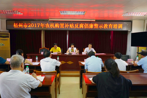 6月14日,梧州市农业委员会召开全市2017年农机购置补贴反腐倡廉警示教育培训会。会议传达贯彻了自治区农机局黄汉全副局长在全区农机购置补贴反腐倡廉警示教育培训会上的讲话精神,对梧州市当前农机购置补贴廉政风险点进行了研究分析,部署了全市2017年农机购置补贴反腐败倡廉工作。