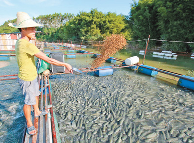 日前,在广西柳州市融水苗族自治县和睦镇古顶村洲上屯,合作社里的莫梦波在喂鱼。