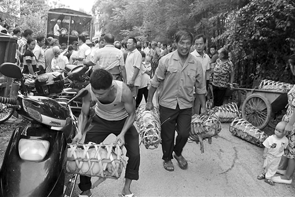 8月10日,在藤县天平镇满村,贫困户正在免费领取猪花。据悉,给贫困户送“免费猪花”是今年该县开展产业扶贫系列活动之一,目前已发放猪花2426头,惠及1213户贫困户。黄群礼/摄
