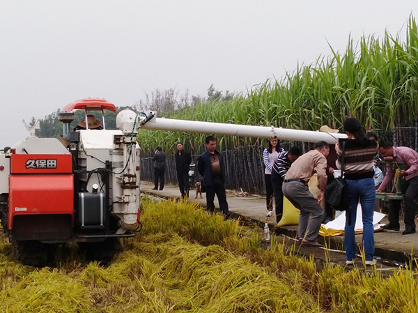 专家组按《全国粮食高产创建验收办法(试行)》的程序和方法,在示范区内选取7个点并在每个点内选择高、中、低产田抽样进行全田收割测产。专家组成员全程跟踪监控,通过严格的收割、脱粒、去杂、称重、测定水分等测产验收程序,最终计算平均产量。宾阳古辣香米示范区核心区、辐射区、拓展区亩产分别为582.8公斤、541.7公斤、547.95公斤,加权平均亩产557.48公斤。