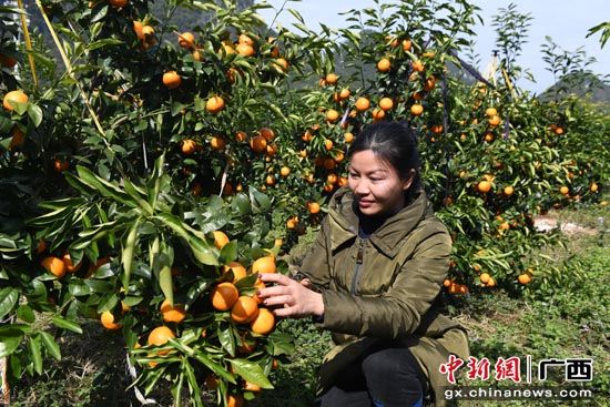 1月11日,广西罗城仫佬族自治县东门镇横岸村大罗屯一果农在采收柑子。罗城县把发展特色水果作为一项扶贫产业来抓,2017年全县新增水果面积1.75万亩,水果总面积达13.54万亩,水果总产量5.8万吨,产值1.8亿元,促进了农民增收。韦如代 摄