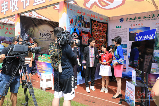 直播中,7位代言人轮番登场,分别为天峨龙滩珍珠李等特色农产品以及秀美的自然风光倾情代言。《八仙迎宾》《筒蹬乐》等精彩的民俗风情展演,让广大游客领略到了该县独特的民俗文化魅力。大集现场集中展出的天峨特产,不仅吸引了众多游客和居民来到现场品尝、购买,还吸引了外地客商前来洽谈签约。同时,通过电视和手机直播平台看直播的观众也纷纷通过扫描电视机下方的二维码,进入淘宝和微商城下单购买,实现了线上线下同步销售。
