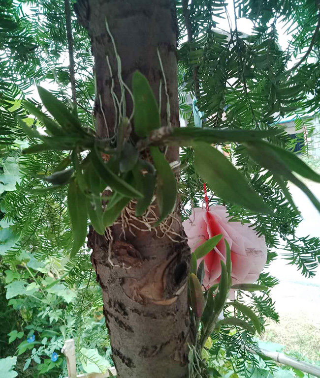仿野生灵芝种植成功后,合作社并没有就此停下探索的脚步。两年前,龙吟村的村民们学习外地经验,在大棚里种植近年来受到市场追捧的铁皮石斛,文庆学知道后并没有立即尝试,而是突发奇想:“能不能仿野生环境把铁皮石斛种在树上?”通过参加区内农产品展销会进行交流学习和在玉林等地实地考察后,文庆学开始着手试验。经过两年的精心培育,文庆学的试验取得了成功。