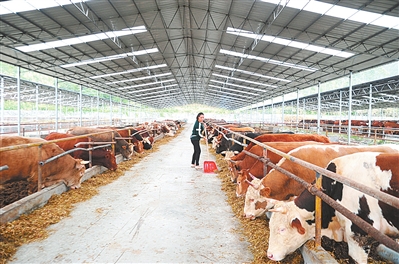 10月24日,在忻城县思练镇长和农牧育肥牛养殖基地,工人正在给牛喂食。近年来,该公司采取“政府贴息、银行融资、公司引牛、农户领养”的养殖模式发展育肥牛产业。目前,存栏553头牛,辐射带动全县2167户贫困户参与肉牛养殖,实现户均年收入4000元以上。