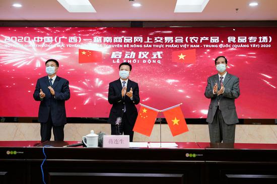 在我区外贸企业积极应对境外疫情蔓延“稳外贸、保生产、保订单”的关键阶段,4月21日上午,自治区商务厅与越南贸易促进局共同举办中国(广西)-越南商品网上交易会启动仪式。自治区商务厅厅长蒋连生、越南贸易促进局局长武伯富、越南驻南宁总领事馆总领事黄玉荣在仪式上致辞,中国驻越南大使馆胡锁锦公参通过视频连线方式致辞,商务部驻南宁特办特派员王德生、越南贸易促进局副局长黎黄才和工贸部亚非司副司长苏玉山参加仪式。