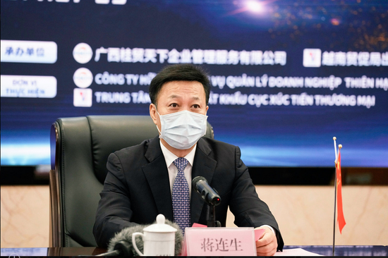 自治区商务厅厅长蒋连生在致辞时指出,举办网上交易会是落实自治区党委鹿心社书记与越南工贸部陈俊英部长通话共识,在携手防控新冠疫情背景下深化桂越双方经贸合作的创新举措。他希望广西与越南进一步加强合作,为企业开展贸易洽谈搭建高效、安全的网上交易平台;采取有效措施,畅通口岸通道,保障友谊关--友谊、东兴北仑河二桥--芒街口岸货运畅通,共同建设中南半岛国际物流网络;加强信息交流,为网上交易提供后续优质服务。同时,希望双方企业抓住这一机遇,扩大进出口,寻找新商机,共克时艰。