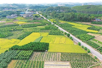 葱翠的果树和金黄的稻田交相辉映。